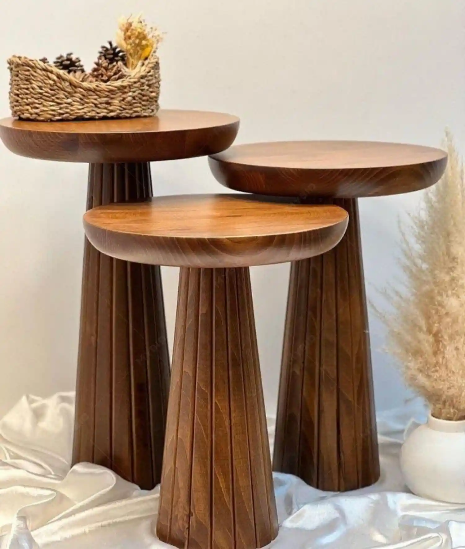 Двухуровневый журнальный столик из темного дерева с плавной, асимметричной формой столешниц и рифлеными цилиндрическими опорами. Выразительная текстура древесины и массивные пропорции делают его самостоятельным акцентом в зоне гостиной. Поможем реализовать подобный проект — переходите по ссылке.журнальный столик, мебель из дерева, дизайнерский столик, органичные формы, мебель на заказ, SHAGAL, coffee table,